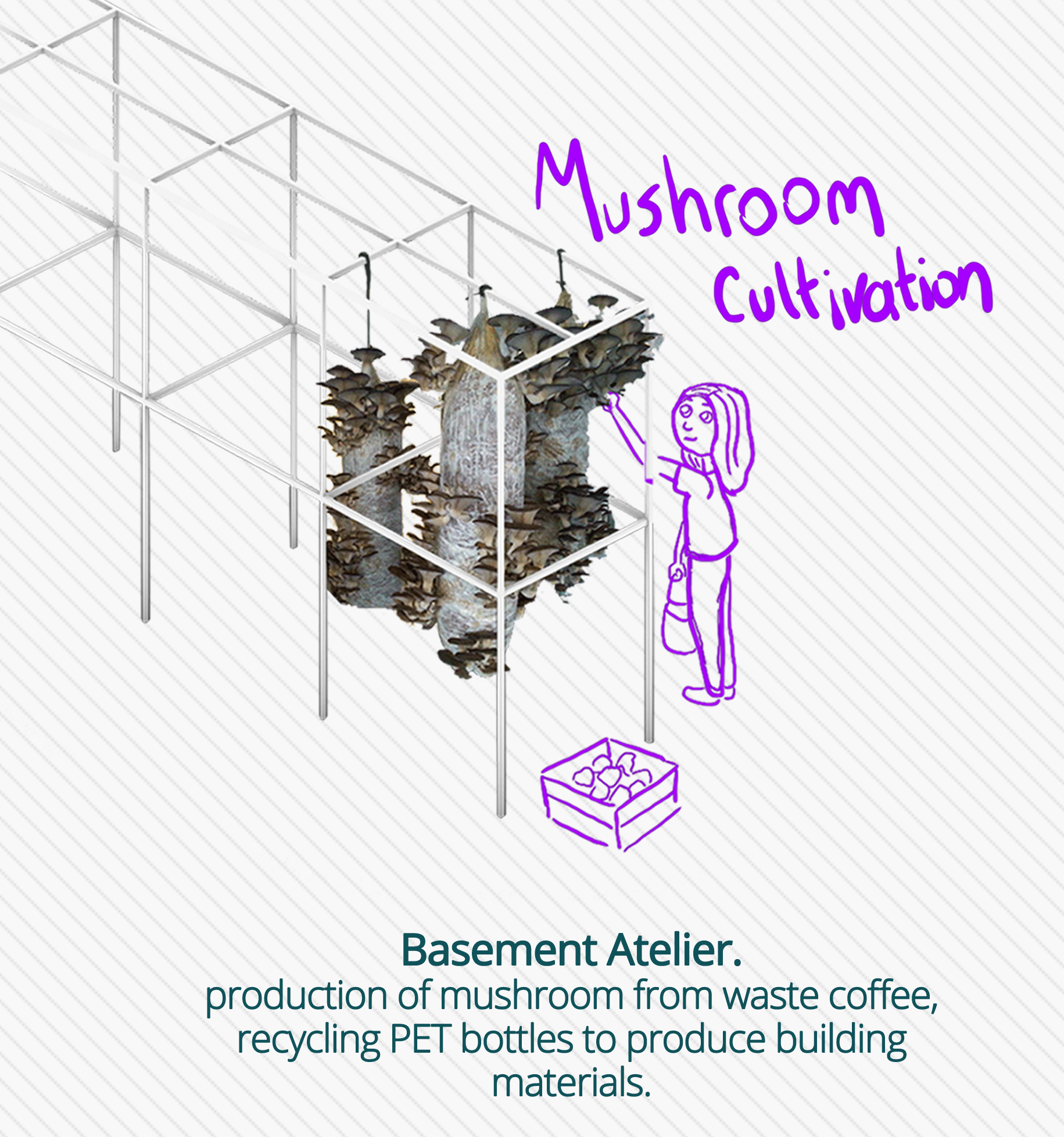 There was revolutionary changes happening in Athens. The neighborhood of Kesariani was chosen as a pilot region for the trial of the complex of “new” dwelling and named as Kesariani No.1. The neighbourhood is a memory place; the closest one to the city center amids the neighborhoods that immigrants of Greeks of Anatolia have been settled down 90 years ago. For this new life-and place of gathering, several intersections aimed to emerge. It is a place allows for attachments between the habitants, the nomads and the transients. The layers of daily life and production becomes intricate with the help of the process of recycling the plastic; cultivation of the lichen and mixture of both: The cultivation of mushroom by utilizing the waste of used coffee. New activities held in between the old refugee houses and their public spaces, new attachments emerged.