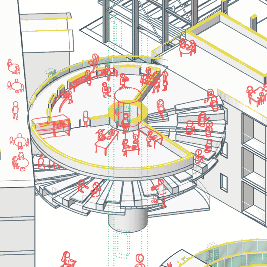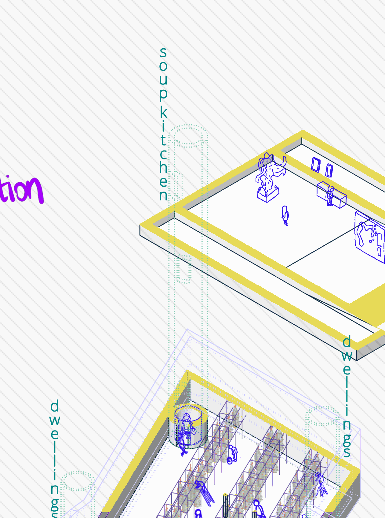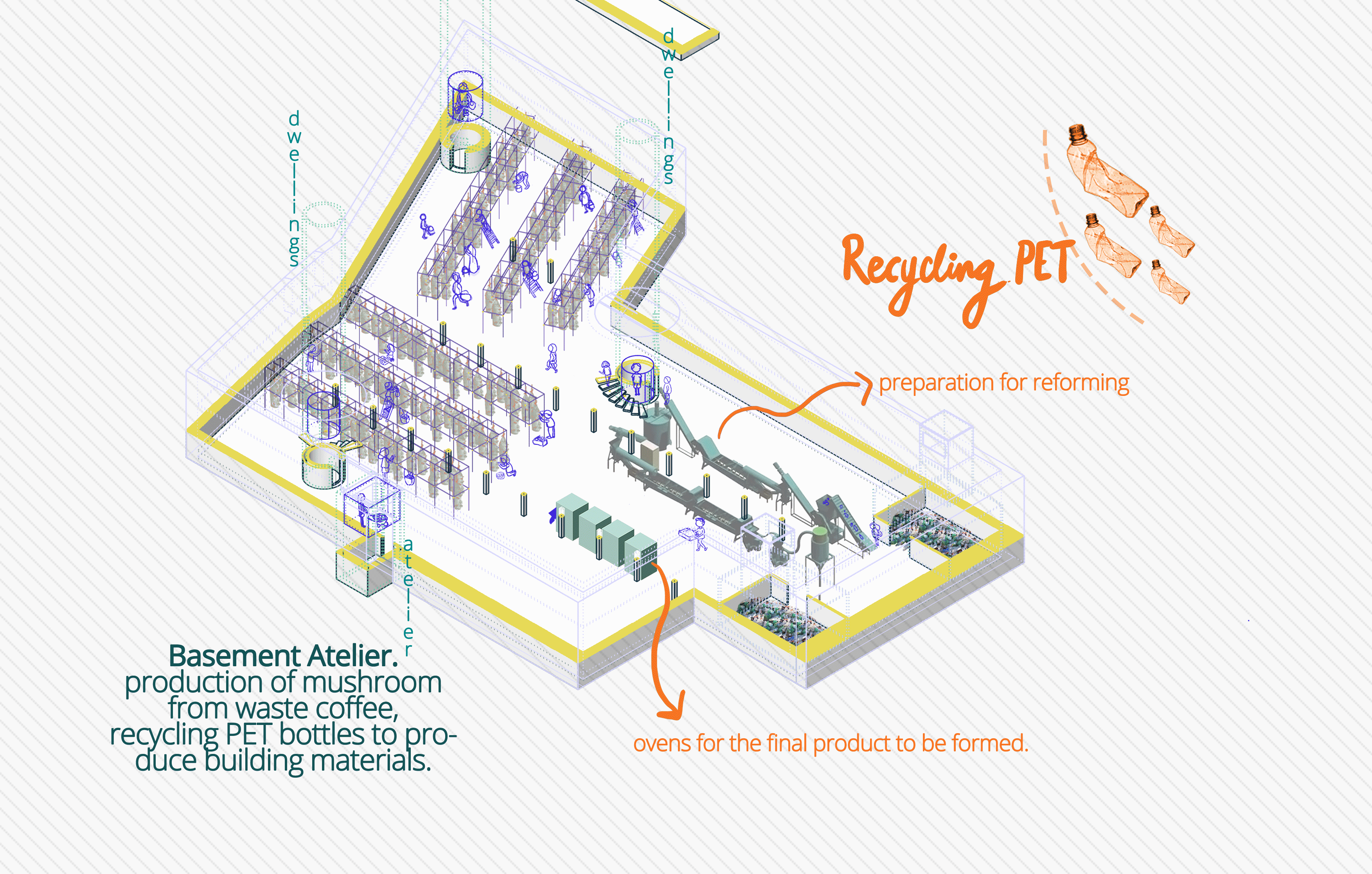 Lichen Cultivation is a new-kind agriculture which is a part of the nourishment production to solve the famine problem and is one of the main processes of the complex. Lichens can survive on almost any surface. The frame that hanged from the structure contains a recycled-plastic granular surfaced material that is light which lichen can cling on. The Basement Ateliers are the ateliers of further productions: Includes mushroom cultivation and the the PET storing/recycling in order to produce construction materials. The Soup Kitchen includes the kitchen, dining area and the food producing atelier which is the follow-up of the cultivation process. Dwelling Type X are single modular dwellings constitutes circular units with the direct connection to the circulation while Type Y consist of two storeyed modular houses with an interrelated pattern. The Theater is a place for the improvised performance, which summons the audiences to join. The Transient Place is a type of accommodation for transient people: Students, backpackers, tourists: the people who are passing-by Athens.