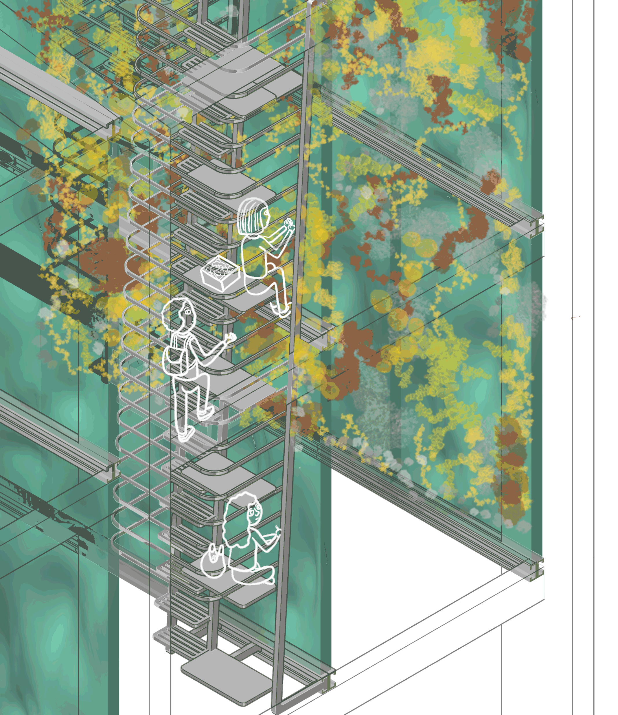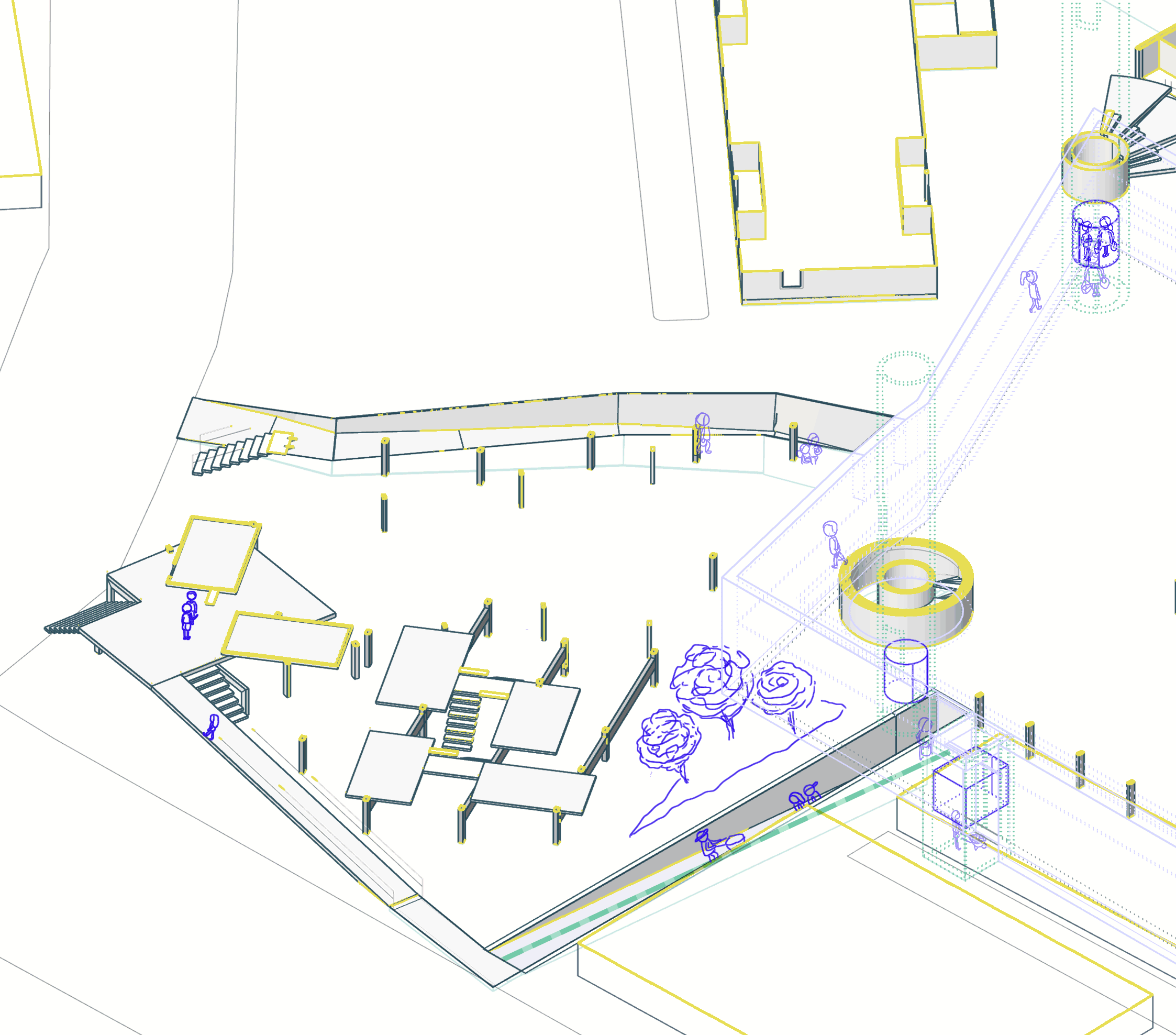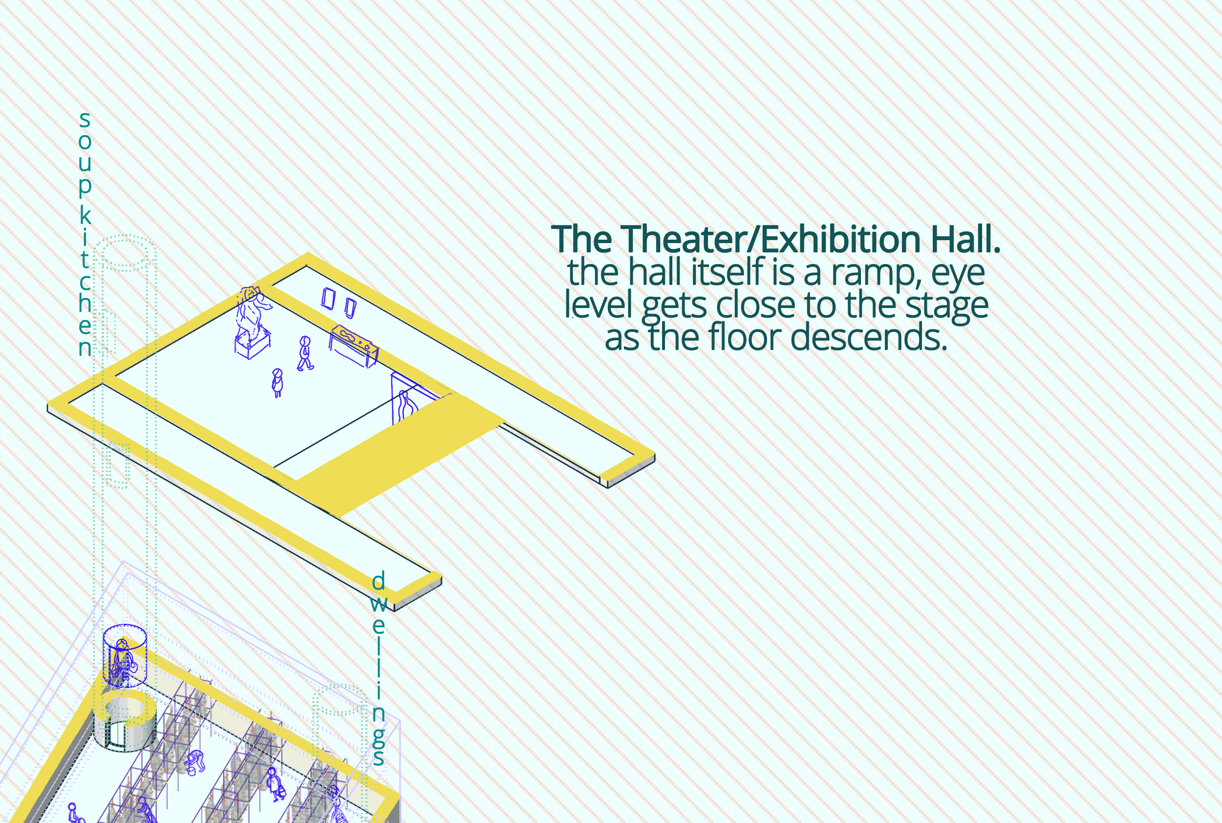 Lichen Cultivation is a new-kind agriculture which is a part of the nourishment production to solve the famine problem and is one of the main processes of the complex. Lichens can survive on almost any surface. The frame that hanged from the structure contains a recycled-plastic granular surfaced material that is light which lichen can cling on. The Basement Ateliers are the ateliers of further productions: Includes mushroom cultivation and the the PET storing/recycling in order to produce construction materials. The Soup Kitchen includes the kitchen, dining area and the food producing atelier which is the follow-up of the cultivation process. Dwelling Type X are single modular dwellings constitutes circular units with the direct connection to the circulation while Type Y consist of two storeyed modular houses with an interrelated pattern. The Theater is a place for the improvised performance, which summons the audiences to join. The Transient Place is a type of accommodation for transient people: Students, backpackers, tourists: the people who are passing-by Athens.